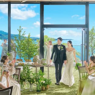 海側のガラス扉を開くと、そこにはウッドデッキのオープンテラスが。グリーンウォールや暖炉も備えられ、心地よい陽射しと風を感じながらゲストとデザートブッフェや写真撮影など、おふたりらしい演出を思う存分お愉しみいただけます。夕方からのトワイライトタイムには、キャンドルを灯してロマンチックなひとときを演出することも。圧倒的な景色を背景に、いつまでも心に残る幸せなひとときをお過ごしください。