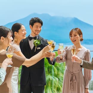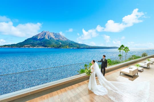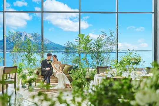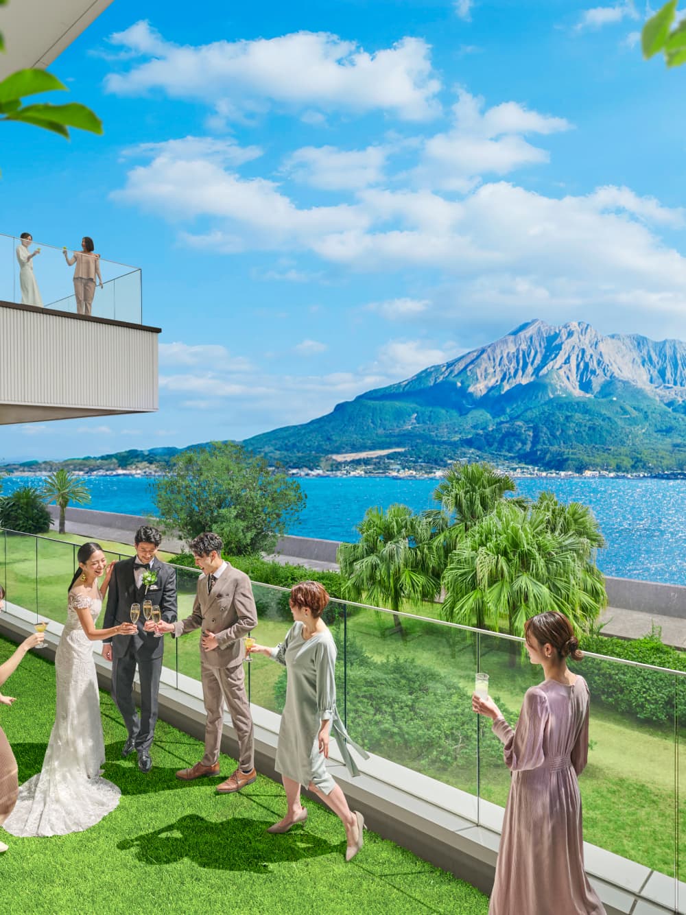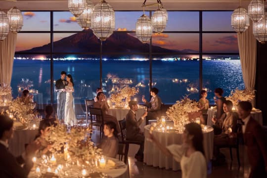 ライトブラウンを基調としたTerre(テール)は156名まで着席可能。ワイドな窓一面に広がる桜島ビューと、木目調の天井やクラシカルなシャンデリアが調和した、シックで落ち着いた雰囲気のバンケットです。この会場の魅力は、なんといってもテラスの広さ。絶好のロケーションを独占してオープンエアーでおもてなしできる、プレミアムな空間です。