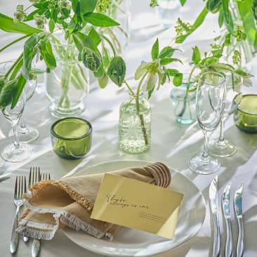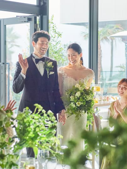 光が優しく差し込む開放的なパーティーはもちろん、幻想的なナイトパーティーなど、おふたりのテーマやご希望に合わせてオリジナリティあふれる演出をご提案いたします。例えば、映像を映し出したカーテンが上がると、マジックウォール(隠し扉)が現れ、そこからおふたりが登場する演出は最高のサプライズに。お好みの音楽を取り入れたり、バーカウンターを使ったりと、おふたりの特別なパーティーに華を添えます。