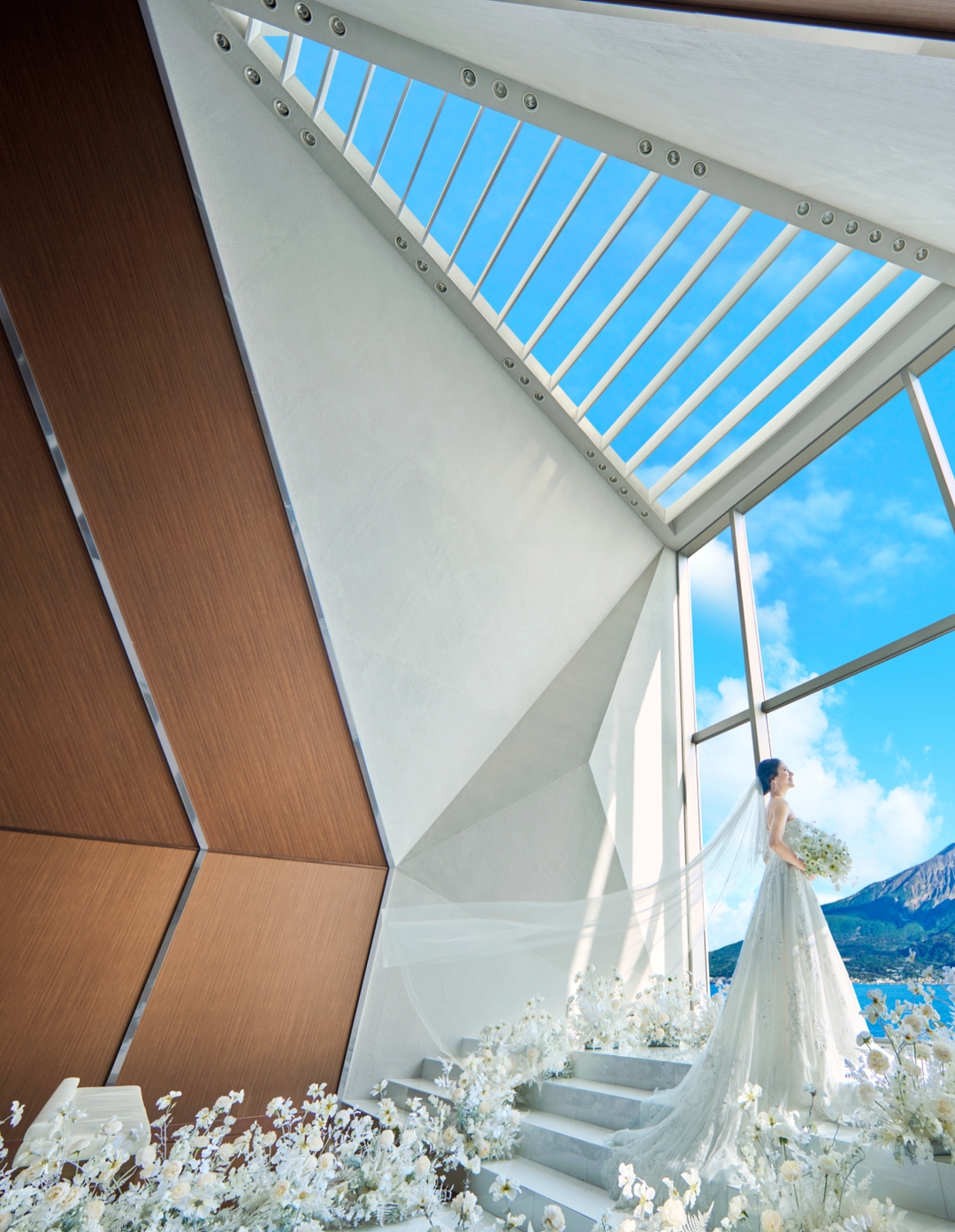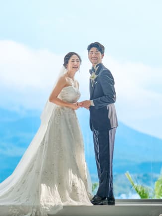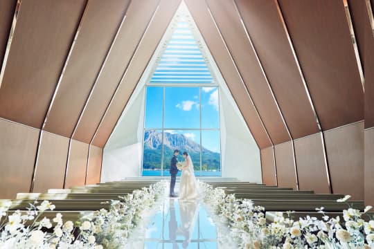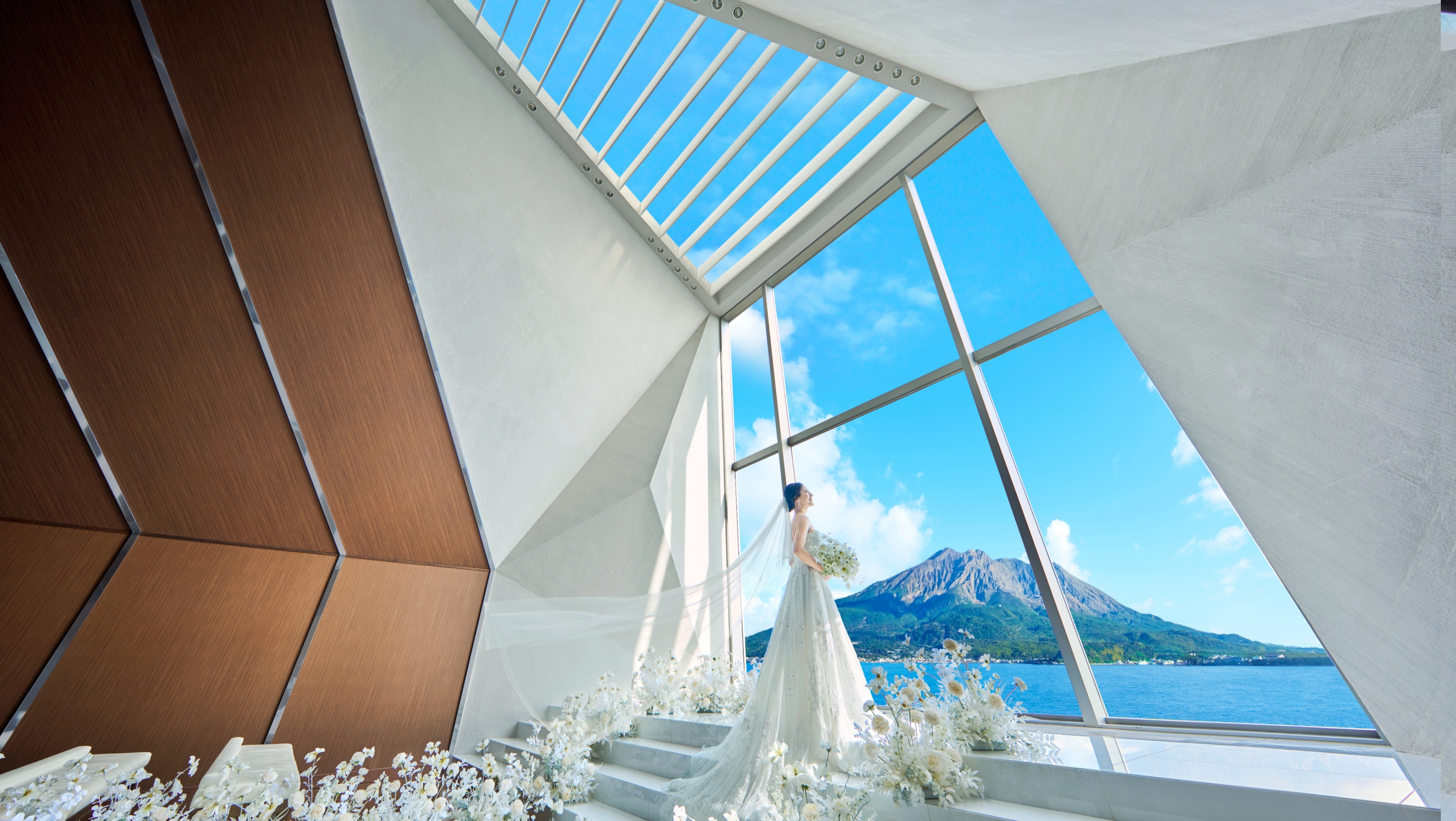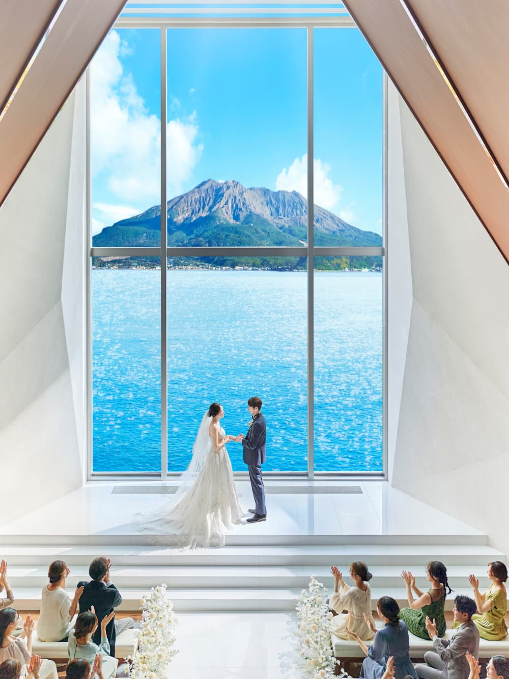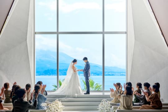 扉が開いた瞬間、目の前に広がるのは一面のオーシャンビュー。まばゆい自然光に包まれながら純白のバージンロードをゆっくり歩んでいくと、桜島の絶景が大きく広がります。その眺めを存分に愉しんでいただくため、聖歌隊は後方上部のオーケストラピットに。高い天井に響きわたる生演奏の美しさも、挙式の感動を盛り上げます。