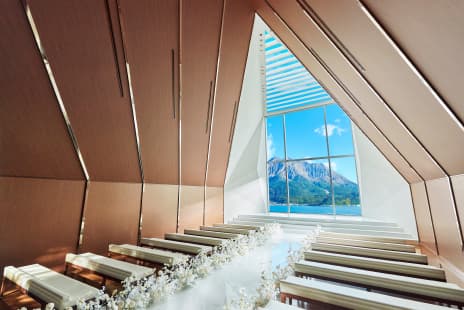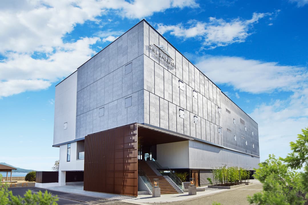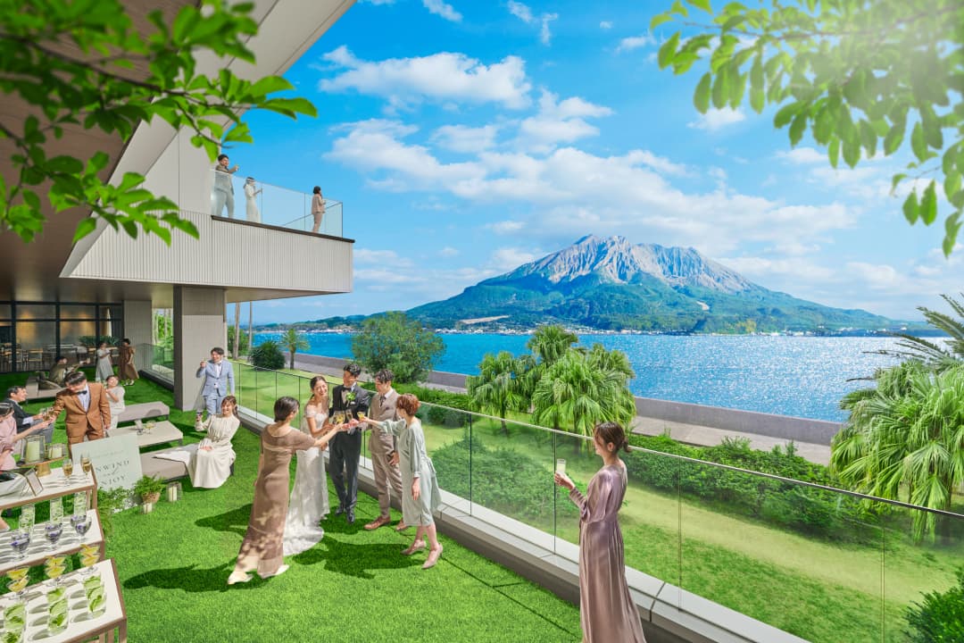 錦江湾に面したウェディングステージ ザ・ベイスイート 桜島テラスの外観は、アートミュージアムを思わせる洗練された佇まいです。入口にはシンボルオブジェが飾られ、これから始まるウェディングへの期待感を高めます。