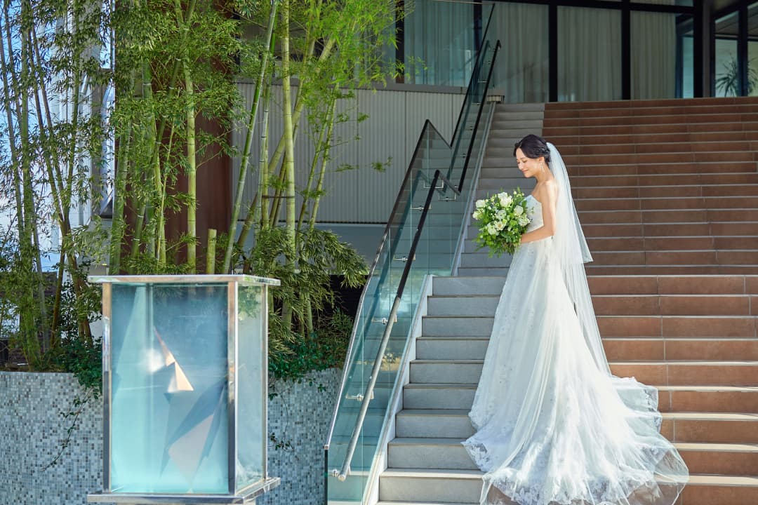 メインエントランスの緩やかな大階段は、ドレスや和装が映えるフォトスポット。大階段を彩る孟宗竹は、ザ・ベイスイート 桜島テラスのシンボルツリーです。その昔、島津藩藩主が貿易で中国から持ち帰ってきた2株が日本全国に広まったと言われ、諸外国の文化を積極的に取り入れてきた薩摩を象徴しています。