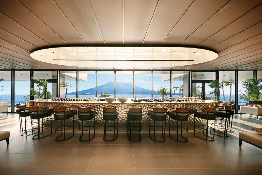訪れたゲストを最初におもてなしするのは、施設の中で最もワイドに空間を確保し、まるで一枚の絵画のような桜島パノラマビューを実現したこだわりのラウンジ。桜島の美しさを愉しむために設計された特等席は、ゲストへの最初の贈り物です。