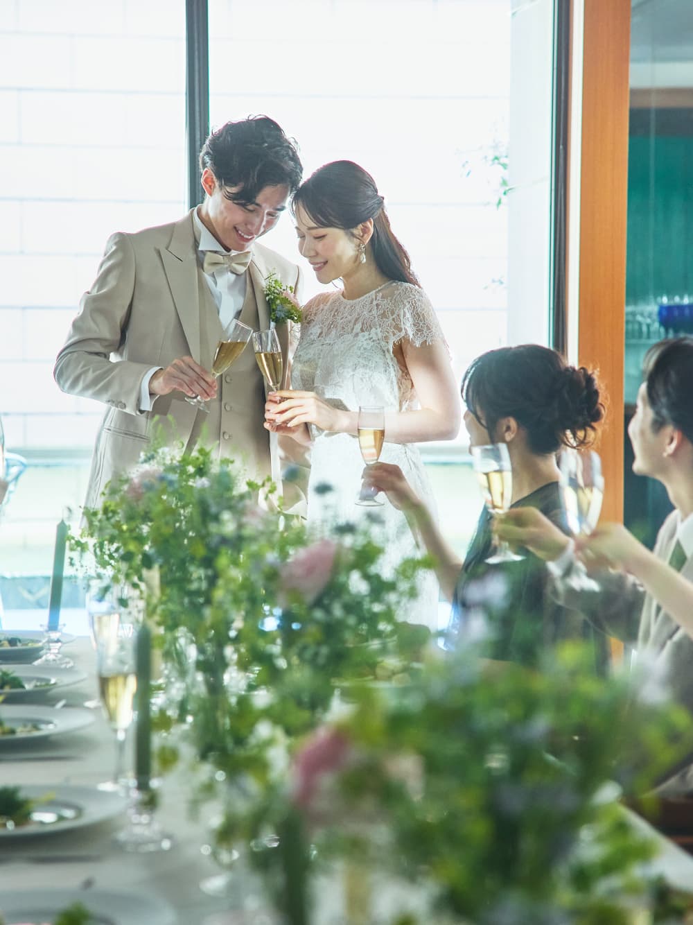 リストランテでは、大切なゲストを貸切空間へお招きする少人数ウエディングが叶います。「おもてなし」と「特別感」を大切にしたいおふたりにぴったりな、心の距離が近いからこそ伝わる温かなひとときをお過ごしいただけます。 美味しいお料理を囲みながらゲストとの会話を愉しまれた思い出の場所に、いつでも帰ってこられるところも、レストランウエディングならではの魅力です。