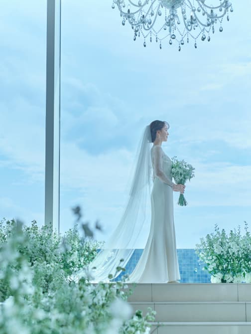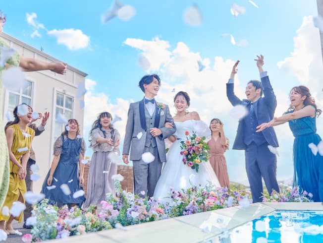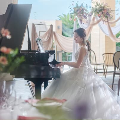 一歩足を踏み入れた瞬間から広がる、非日常の圧倒的空間。 グレイスヒル・オーシャンテラスは、 海・青空・緑に囲まれた贅沢空間と高評価の美食で ふたりらしいパーティーを叶えていただけるウエディングステージです。