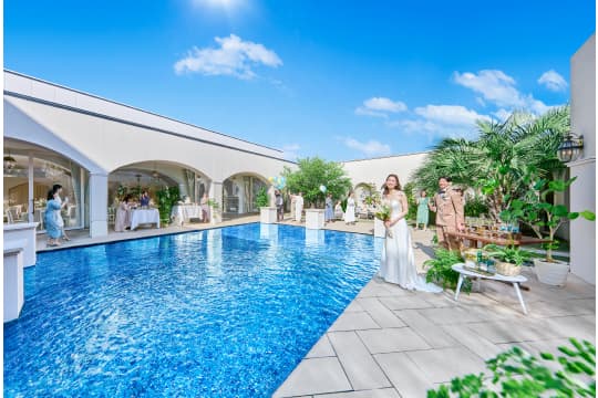 美しいアーチを描くバンケットの窓からは、プールのあるプライベートガーデンの景色が広がります。バンケットから続く開放的なガーデンを自由に使えば、まさに楽園にいるようなリゾートウエディングを実現できます。リラックスした雰囲気の中、デザートビュッフェやドリンク片手の歓談タイムなど、ゲスト全員と会話を愉しめる笑顔あふれるひと時をお過ごしください。