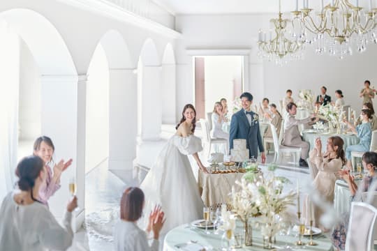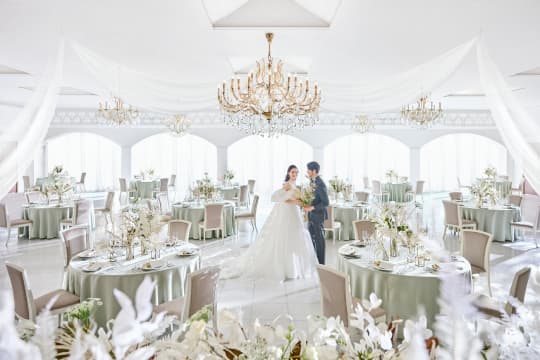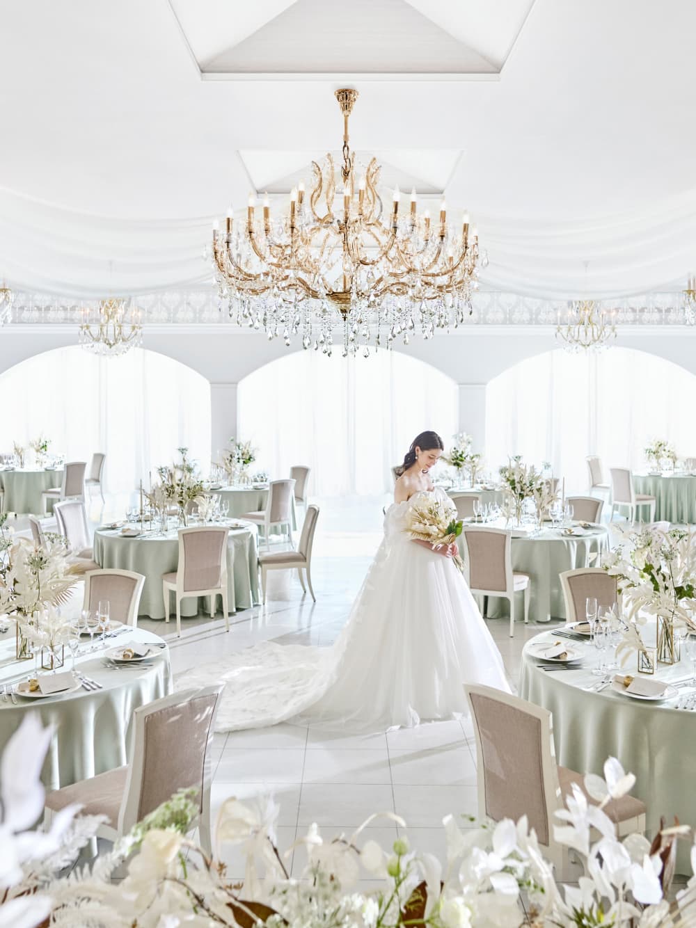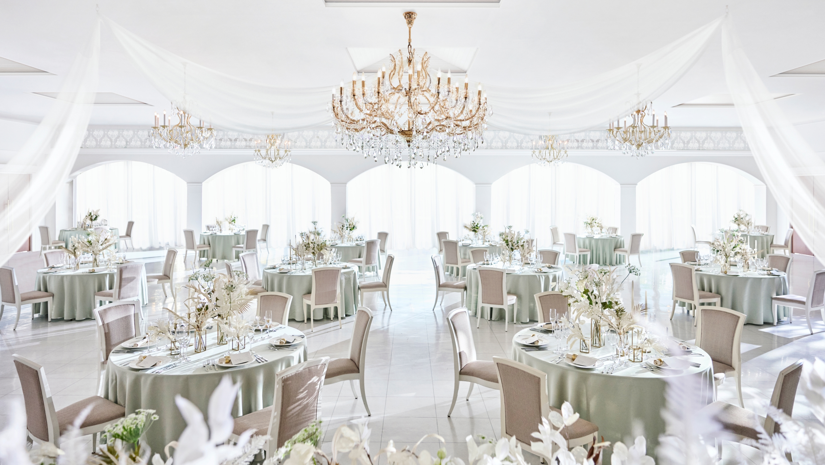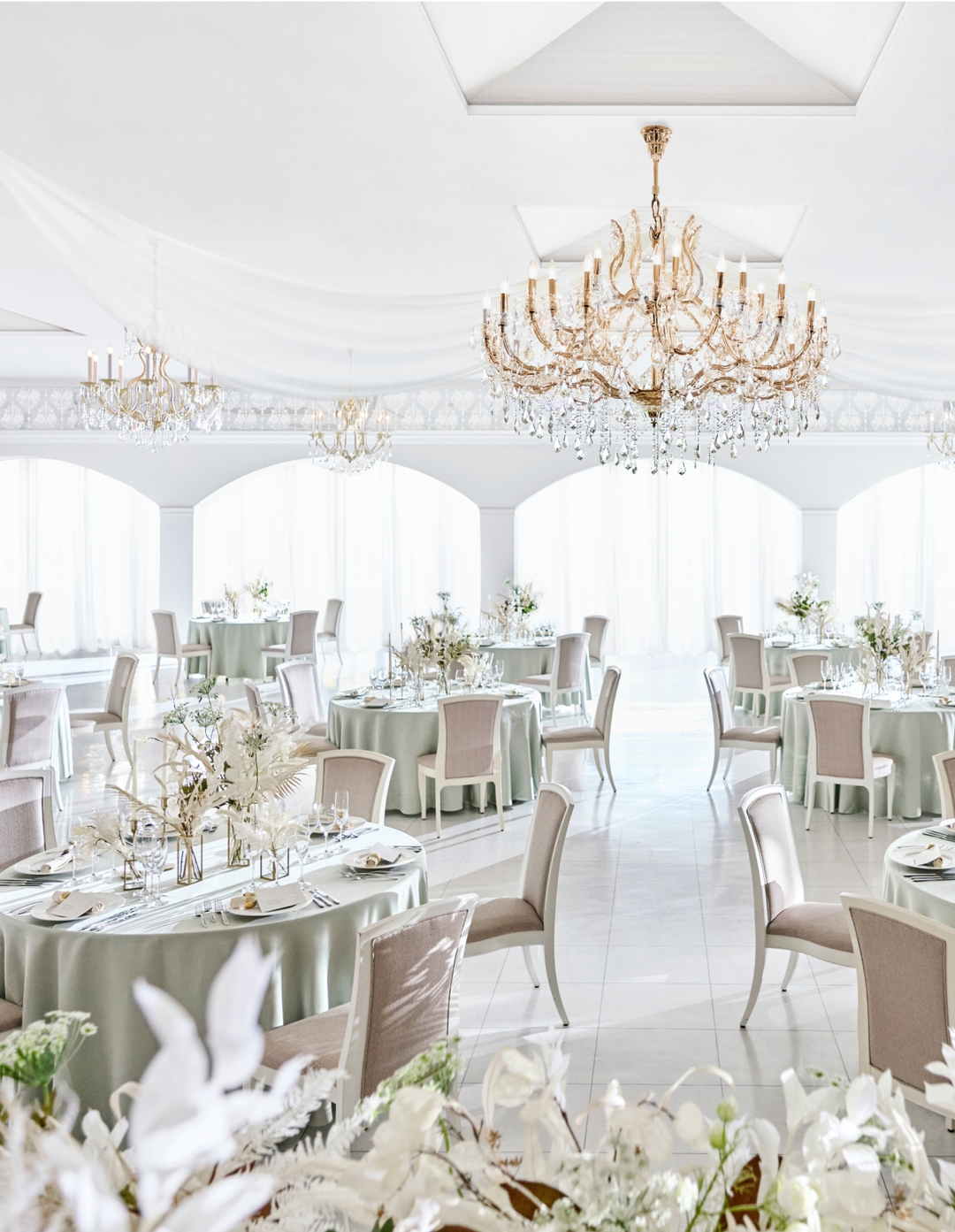 華やかで開放的な雰囲気に包まれた、フレンチコロニアルスタイルの上品なバンケット。白を基調とした空間は、お花や小物のアレンジ次第で、雰囲気や印象を変えられるのが魅力。おふたりのテーマに合わせた、多彩なコーディネートが映える空間です。