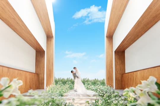天窓に映し出される青空と降り注ぐ陽光がおふたりを祝福する、開放感あふれる“sora”のチャペル。 美しい青空と光に満ちた自然に包まれる荘厳なセレモニーが実現できます。 また、チャペル前の大階段やガーデンで水と光に彩られた印象的なアフターセレモニーも叶えられます。