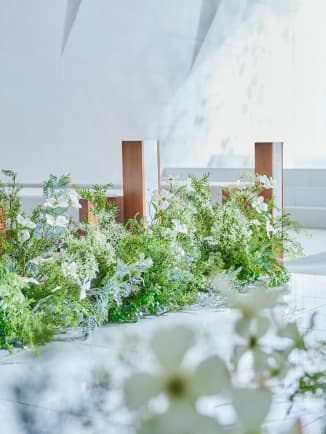 チャペルの祭壇の奥、一面のガラス窓の先には上空から清らかな滝が降り注いでいます。吹き抜けの空間から差し込む自然光は水の流れに反射し、おふたりの最高の瞬間をより一層美しく輝かせます。天候に関わらず明るい自然光が満ちる美しい空間の中で、神聖なセレモニーを叶えていただけます。