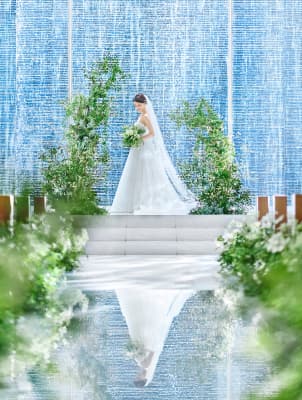 KOTOWA 京都 八坂のチャペルは、柔らかな光と純白の空間に包まれた空間。 高い天井と、祭壇の先の吹き抜けから降り注ぐ自然光、 そして流れ落ちる滝水のきらめきが、おふたりの姿を美しく引き立てます。 心地よい緊張感に包まれながら、大切なゲストの方々と、祝福に満ちた誓いのひと時をお過ごしください。