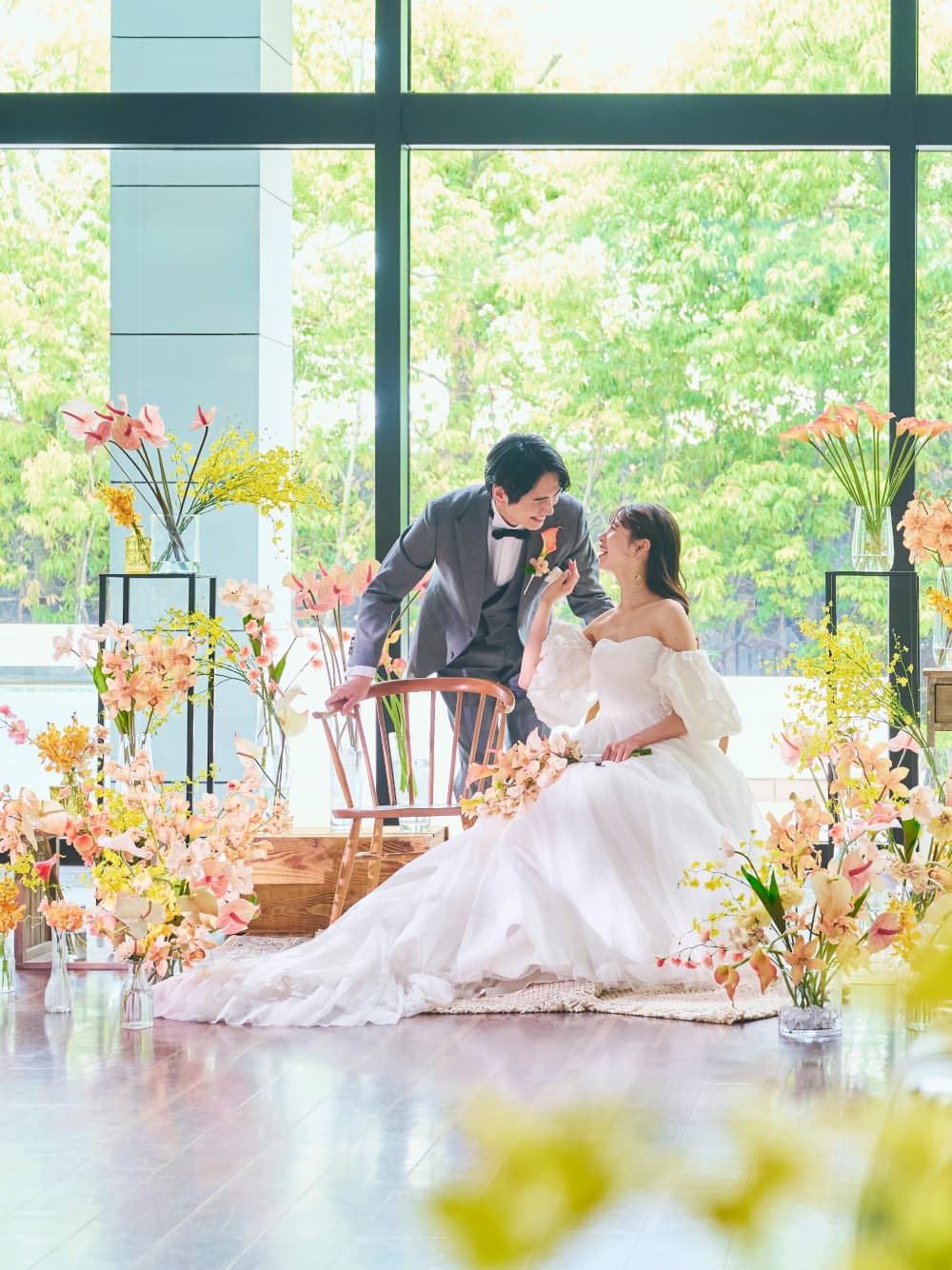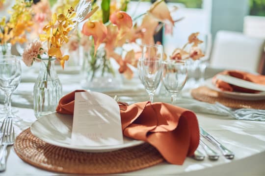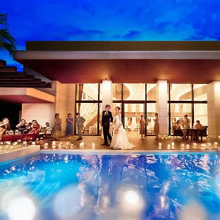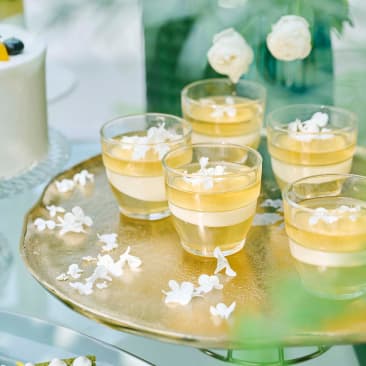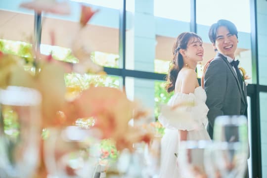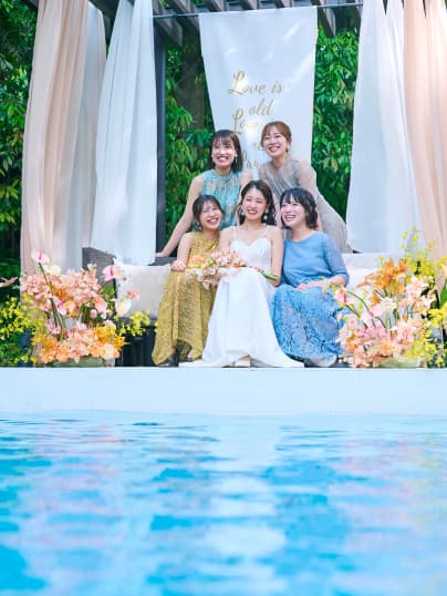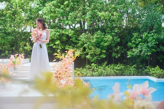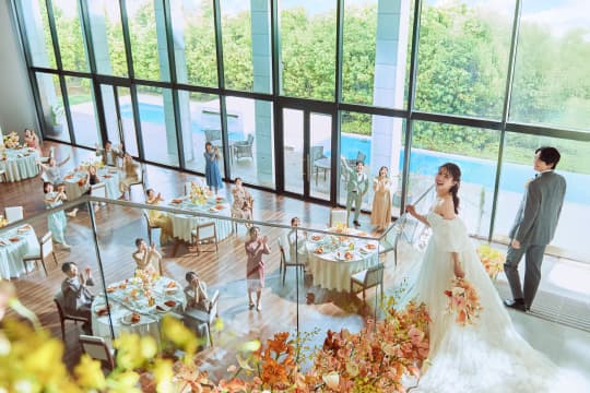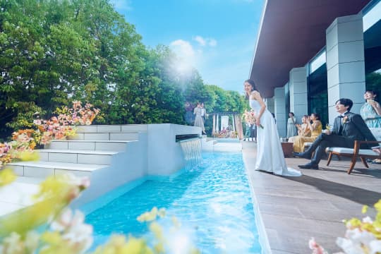 ガラス窓の向こうに広がるのは、プールを備えた開放的なガーデン。青空の下で緑と水が美しくきらめき、リゾートウエディングのような開放的なひとときをお愉しみいただけます。水辺でのカジュアルな歓談タイムはもちろん、水上ステージからのサプライズ入場やガーデンを使ったデザートビュッフェもおすすめです。