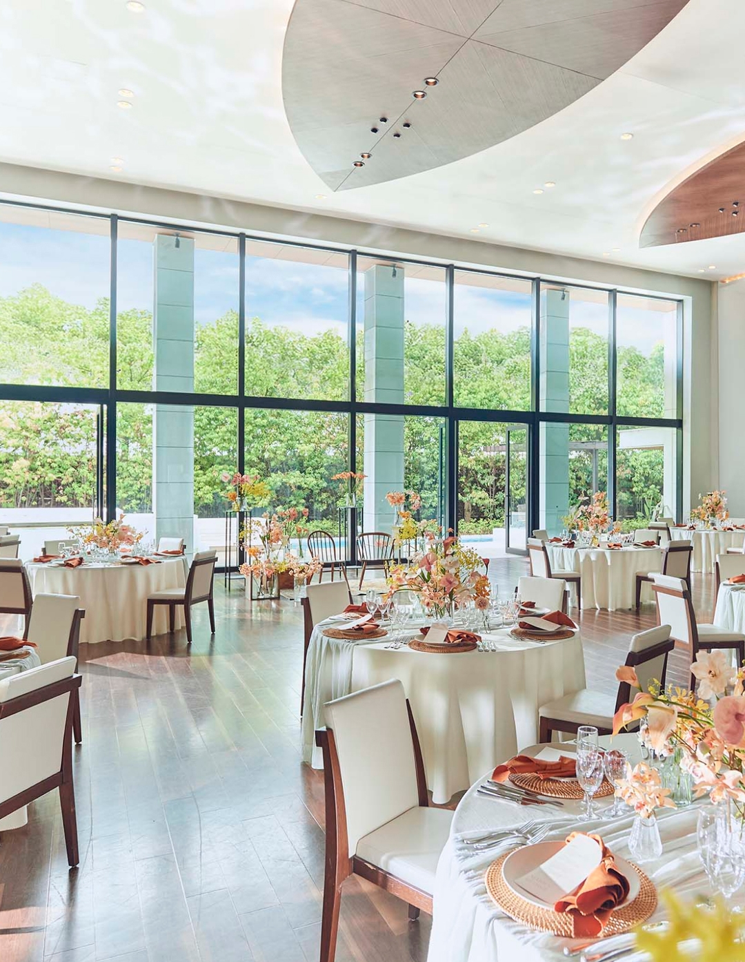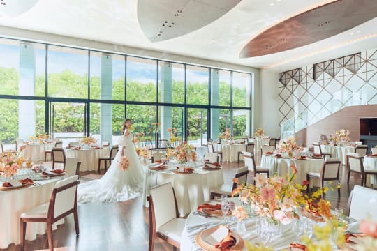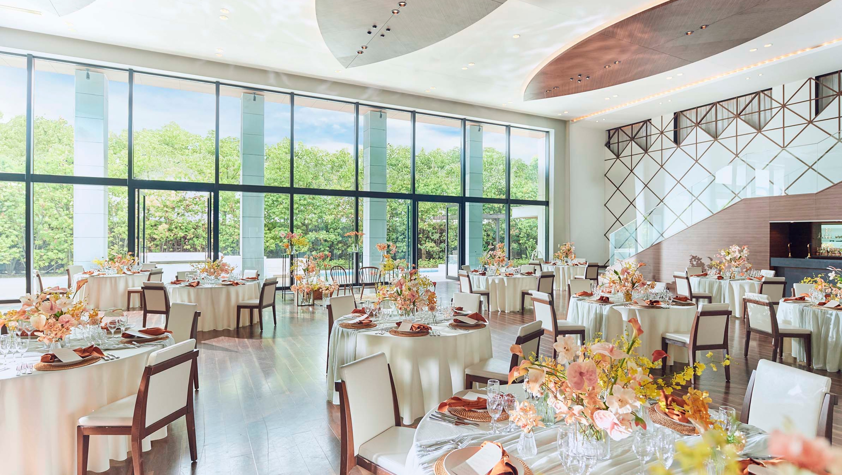壁一面の大きなガラス窓からガーデンの風景を取り込む、ナチュラルモダンなバンケット。プール付きのリゾートフルなガーデンを自由に使い、リラックス感あふれる、心地よいパーティをお愉しみいただけます。