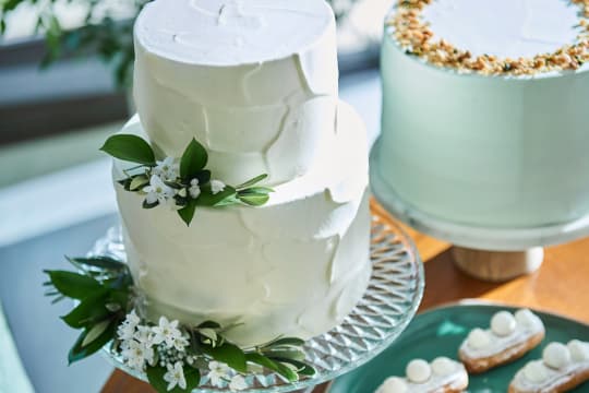 パーティーを華やかに盛り上げ、素敵な記憶として心に残るウエディングケーキ。ザ・リーヴス プレミアムテラスでは、おふたりのお話を伺いながら、想いを形にしたオリジナルのウエディングケーキやデザートブッフェをご提案します。