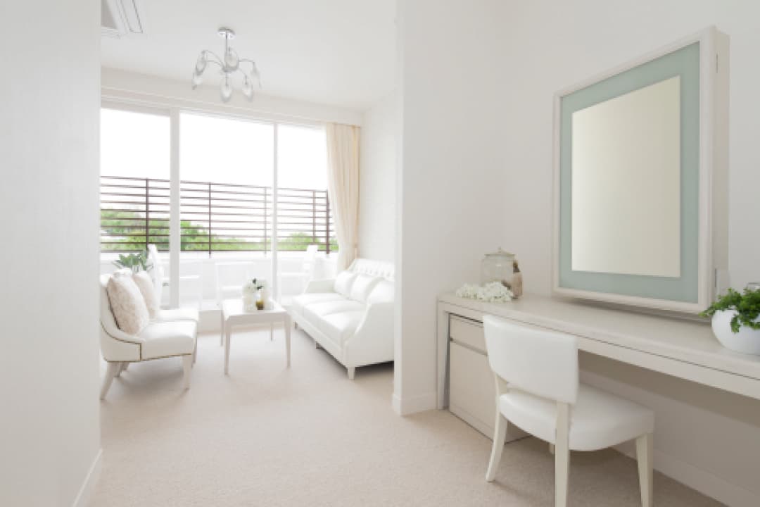 リラックスしてゆっくりとお仕度いただけるよう、明るくゆとりのあるブライズルームをご用意しております。式の後はブライズルームでゆっくりとお食事をお楽しみいただけます。