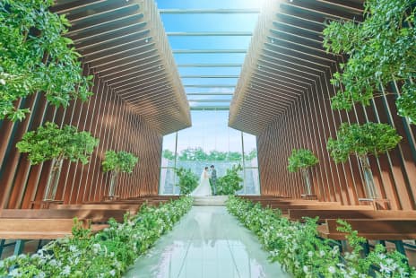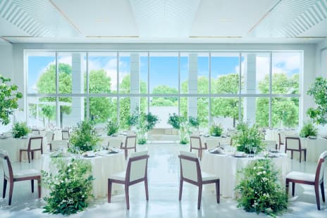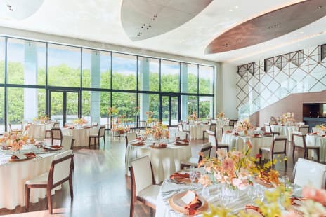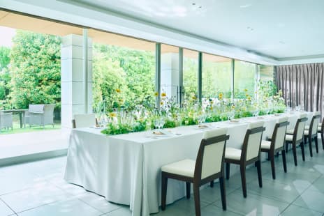 大切なゲストの皆さまにも快適にお過ごしいただける広くゆとりのあるラウンジは、バンケットのデザインと調和する上質でスタイリッシュな空間。式のテーマに合わせて自由に装飾をしていただけます。また、ラウンジは外のガーデンと繋がっており、ガーデンを使ったウエルカムパーティーも行うことが可能です。