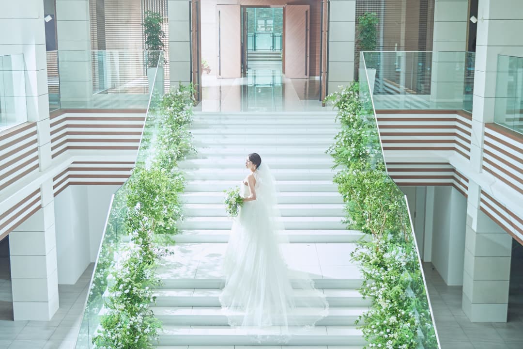 ゲストをお招きするエントランスは、2階まで吹き抜けになった大空間。中央にある純白の大階段では、フラワーシャワーやフェザーシャワーなどの華やかなアフターセレモニーをお愉しみいただけます。