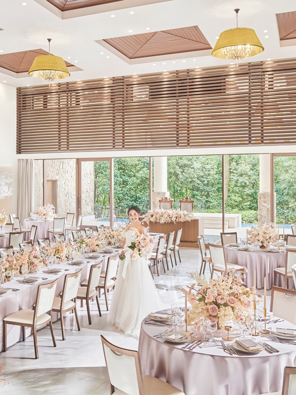 自然光がたっぷり差し込む、広々とした吹き抜けのバンケット。非日常的な開放感が、特別な時間を華やかに彩ります。白を基調に、オレンジ色の間接照明を用いた上質で明るい空間では、遊び心いっぱいのアレンジやおふたりらしいコーディネートも思いのまま。バンケット内には大階段も備え、おふたりの入場シーンをドラマチックに演出します。