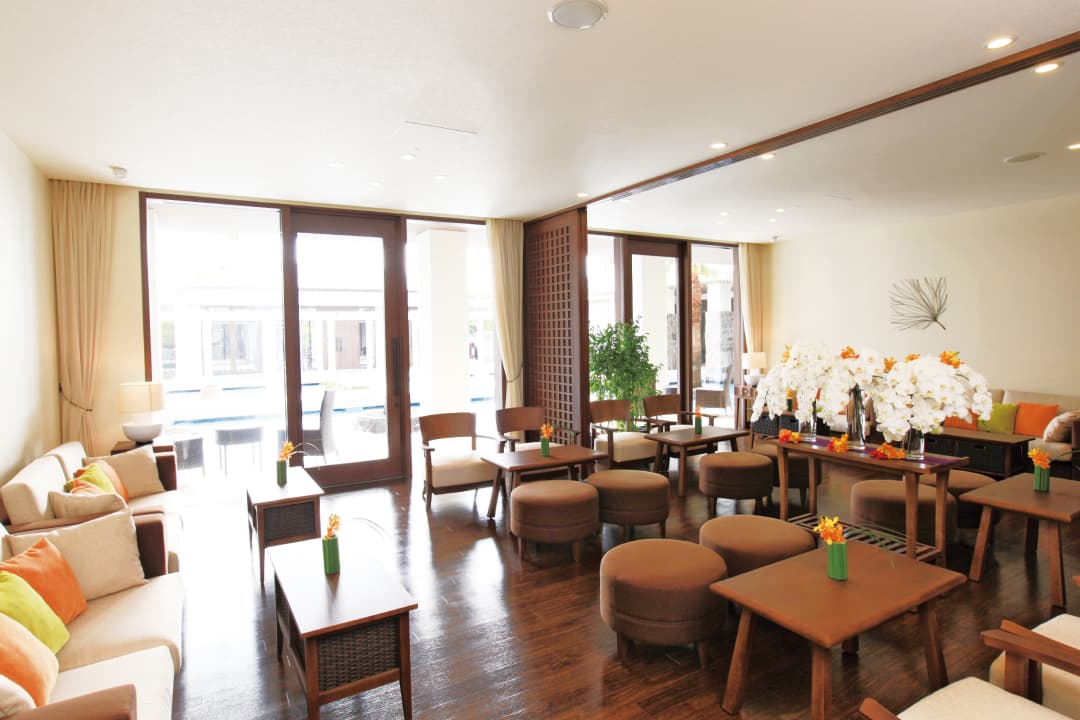 オリエンタルなデザイン、心地よい水の音、ほのかに漂うアロマの香りと、五感でリゾートを感じられる贅沢なロビー。クロークも完備し、ゲストの皆さまを充実の設備でお迎えいたします。