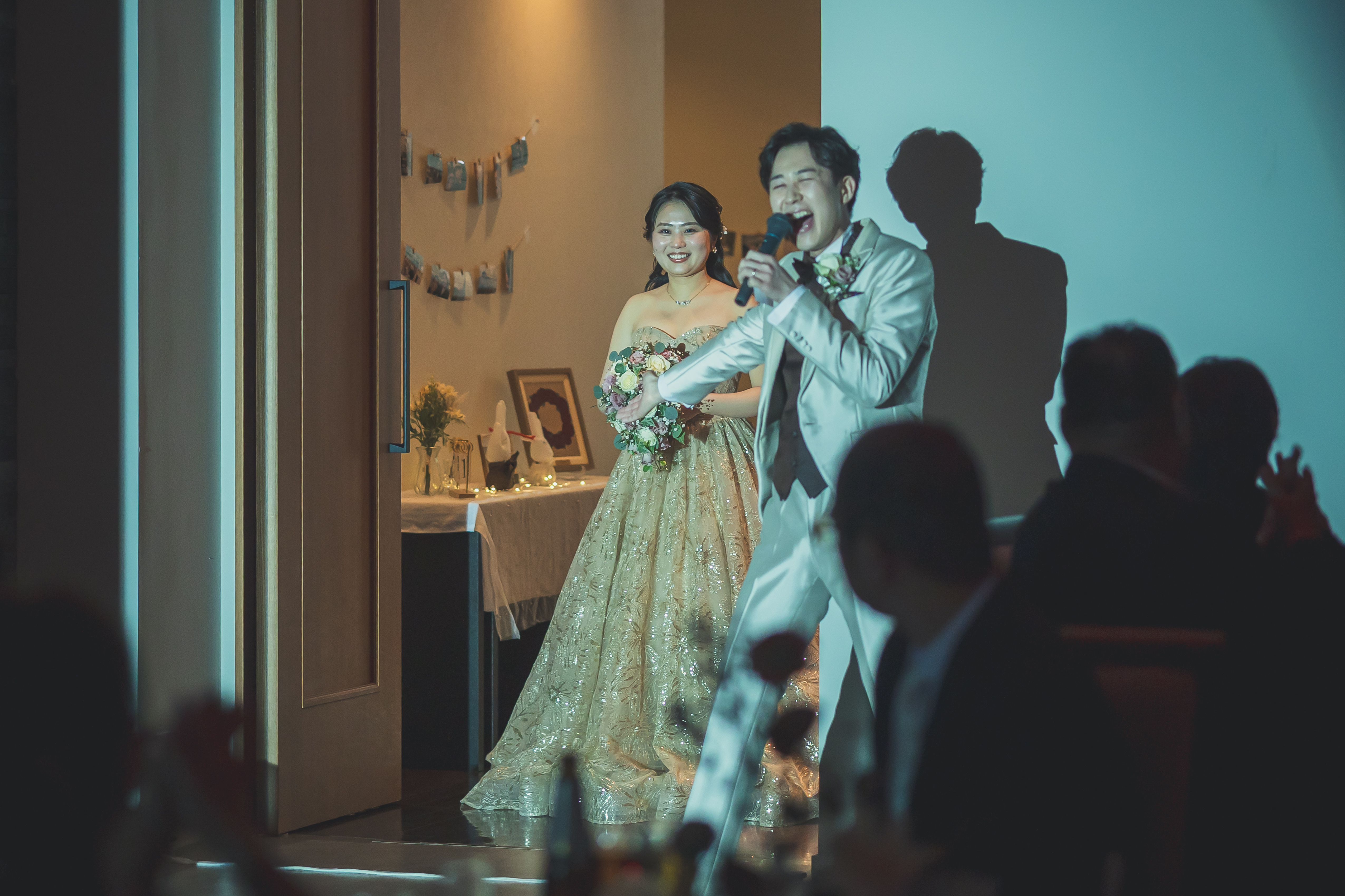 新郎・りょうさんがマイクを手に、歌いながら登場するというサプライズ演出にゲストは驚きと喜びで大盛り上がり。その後、クライマックスに向けて会場の空気は一変します。親御様やゲストへ感謝を伝えるシーンでは、おふたりの誠実な姿を通して、