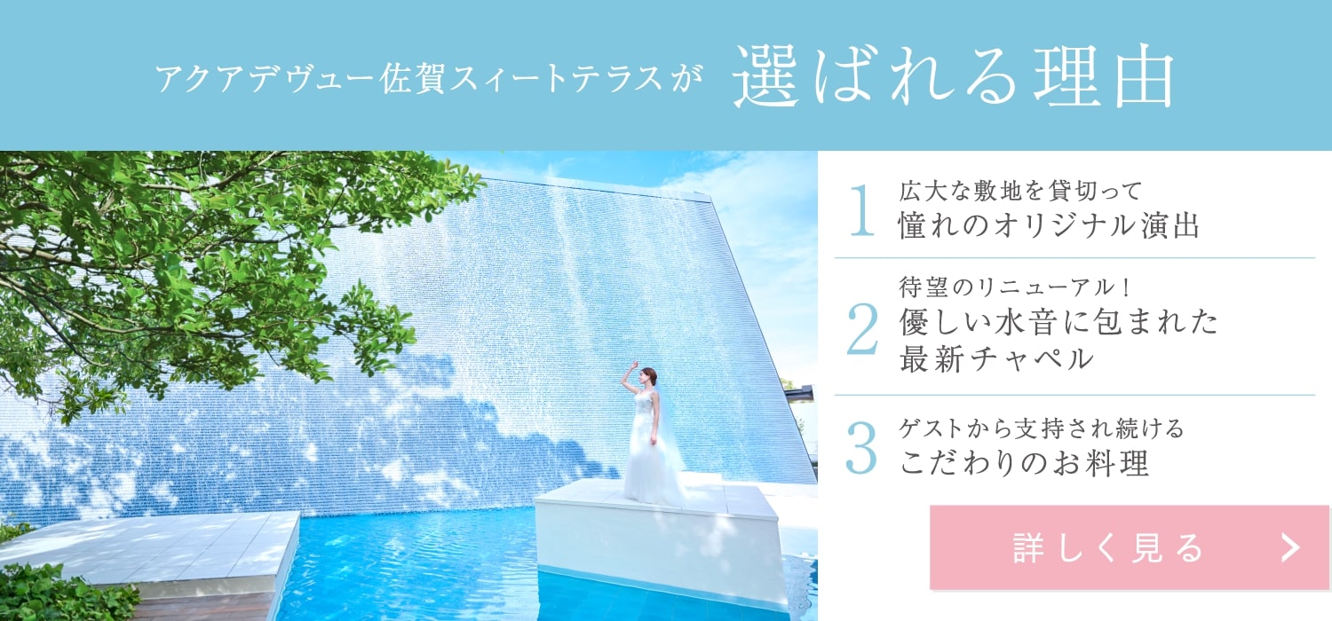 アクアデヴュー佐賀スィートテラスには、おふたりのスタイルに合わせてお選びいただける