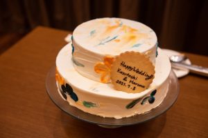 そして、おふたりこだわりのウエディングケーキは、まるで油絵のようなデザインで、ゲストの皆様が思わずカメラを向けるほどとてもおしゃれでおふたりが創り上げた会場のコーディネートにもぴったりでした!