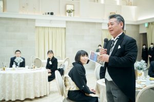 例えば、ご新郎ご新婦様がそれぞれ、ご自身のお父様やお母様、ご兄弟のお人柄などを紹介していくという時間はいかがでしょうか?アクアデヴューでは挙式の前にご親族紹介のお時間を作らせていただくことが多いのですが、ご家族様のご結婚式だからこそ、おふたりから披露宴スタート後にお互いのご家族様をご紹介することで会話がしやすくなったり、温かい雰囲気が作りやすくなります。