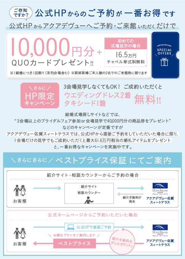 他の式場紹介サイトや式場紹介デスク・相談カウンター経由にてご予約をいただく場合よりも