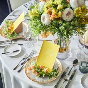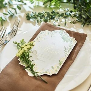 春夏ウエディングや、ガーデンテラス付きの会場などにも映える、スタイリングです。卓上メニューが主役になるナフキンなら「デルタ折」がオススメ!