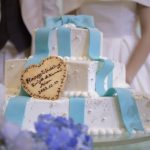 シンプルなウエディングケーキにアクセントとして青リボンを飾り