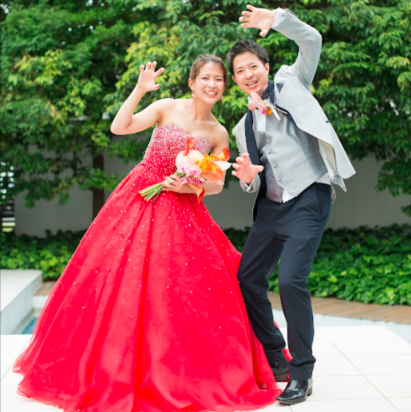パキッとしたお色味が印象的なレッドカラーのドレスは
