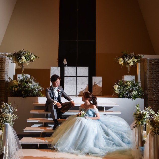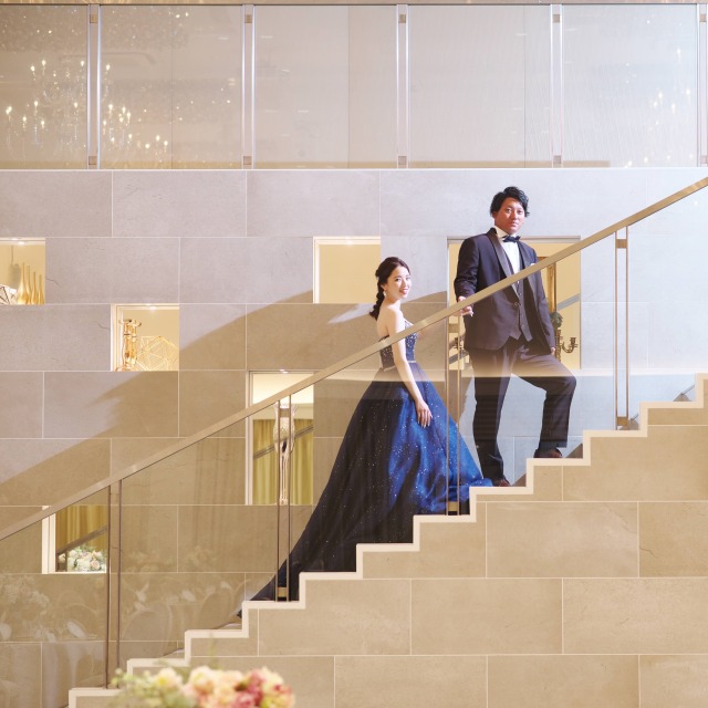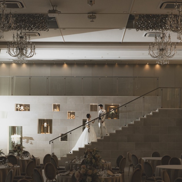 純白な会場の階段で撮影する、ドラマチックなショット。