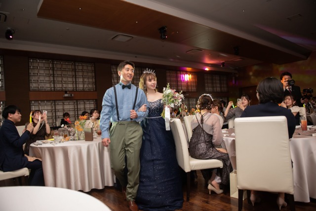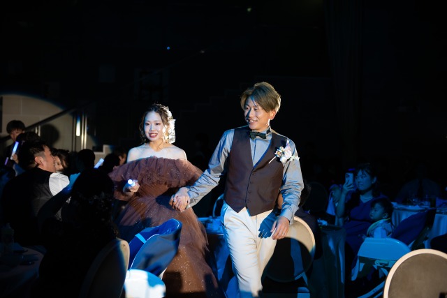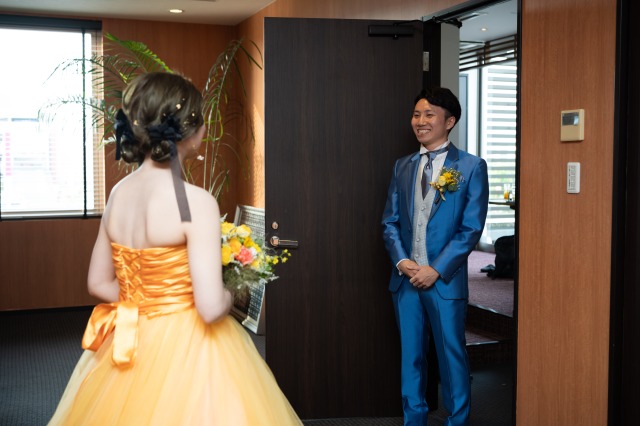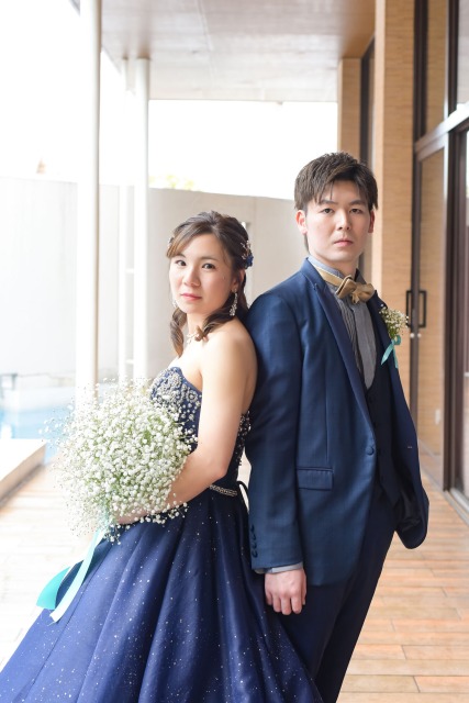 対比の色味を合わせ、おふたりの主役感をより際立たせるブルーのタキシード!