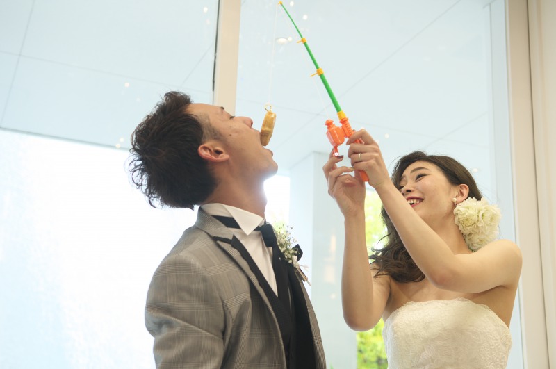 皆様こんにちは^^ 先日行われたスマイルでの様子をお届けさせて頂きます♡ 新郎の趣味が釣りということで登場...