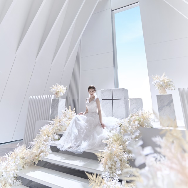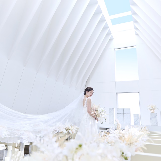 2024年9月にリニューアル!高さ8mの外壁から水が流れる「アクアストリーム」が印象的な独立型チャペルは、天窓からふりそそぐ光がおふたりを優しく照らします。