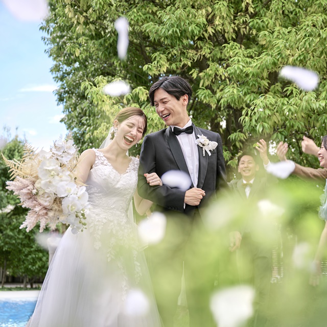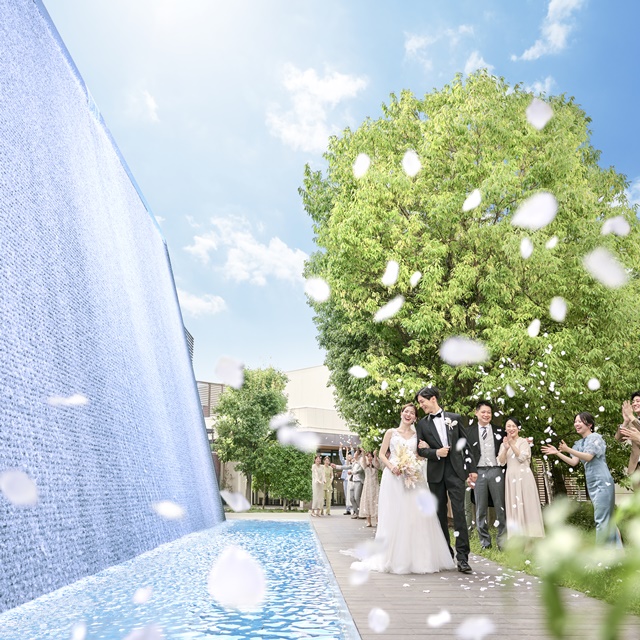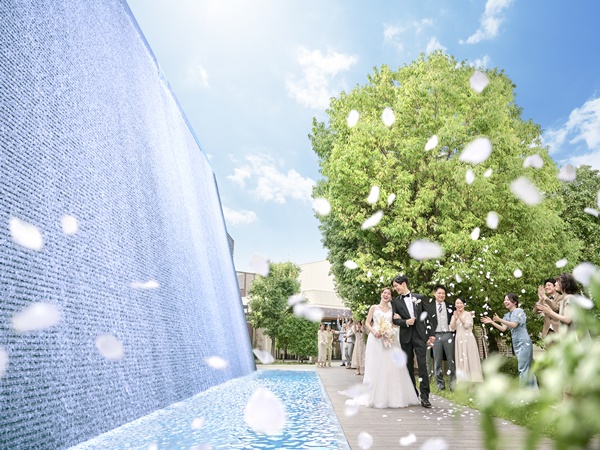 祭壇奥には外の空間へと続く扉があり、挙式後にはその扉がゆっくりと開かれます。差し込む一筋の光に導かれながら、そのまま開放的なチャペルガーデンへ。空と緑、水が織りなす心地よい空気の中、ゲストと共にフラワーシャワーやバルーンリリース、記念撮影などのアフターセレモニーをお愉しみいただけます。