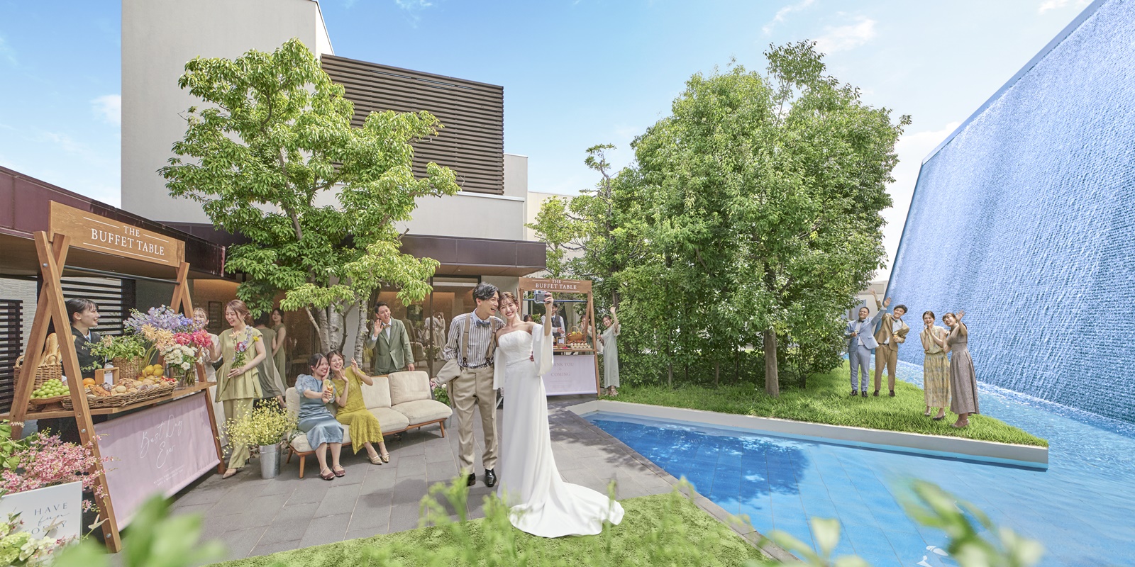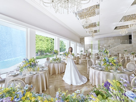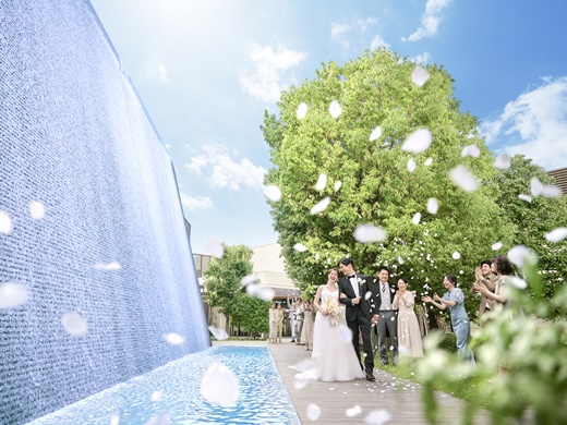 高さ8mの外壁から水が流れる「アクアストリーム」が目を引く、スタイリッシュな独立型チャペル。挙式後は祭壇奥の扉が開き、そのまま光あふれるガーデンへ。青空の下、ゲストの笑顔に包まれながら印象的なアフターセレモニーをお愉しみいただけます。