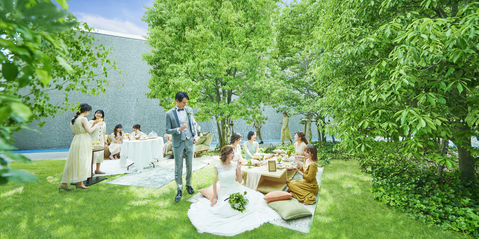 2500坪もの広大な敷地には、シンボルであるアクアストリームチャペルを中心に、開放的なガーデンとアクアテラス、おふたりらしい自由なスタイル・演出を叶える洗練された2つのバンケットが配置されています。会場すべてが笑顔に包まれた夢のようなパーティーをお愉しみいただけます。