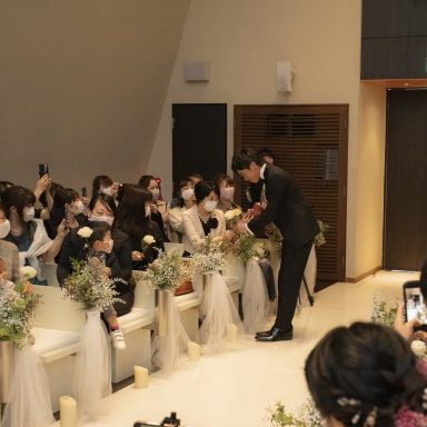 プランナーさんからの提案で挙式はブーケブートニアセレモニーを行いました。
