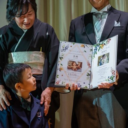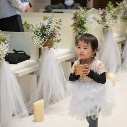 親族家族のみの小規模の挙式、披露宴を行いました。少ない人数だからこそ触れ合う時間をしっかり取りたいと思い、各卓を周り、一緒に写真を撮り、話をする時間を楽しみました。また、親族家族に楽しんでもらいたいという思いが伝わるように、私達だけでなく、親族家族にもスポットライトが当たるように内容を工夫しました。会場内に私たちの幼い頃の写真や親族家族の写真をたくさん飾っていただき、温かみがある式を行うことができました。
