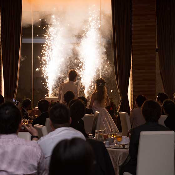 初めて見た時からレーザー演出に感動しやりたいと決めていました。好きな歌に合わせて、専門のスタッフさんが要望に合わせ作って下さいました。カーテンが大きく開いて登場する所はお気に入りです。花火の演出も最後のサプライズとして会場の皆さんと見た花火は感動しました。