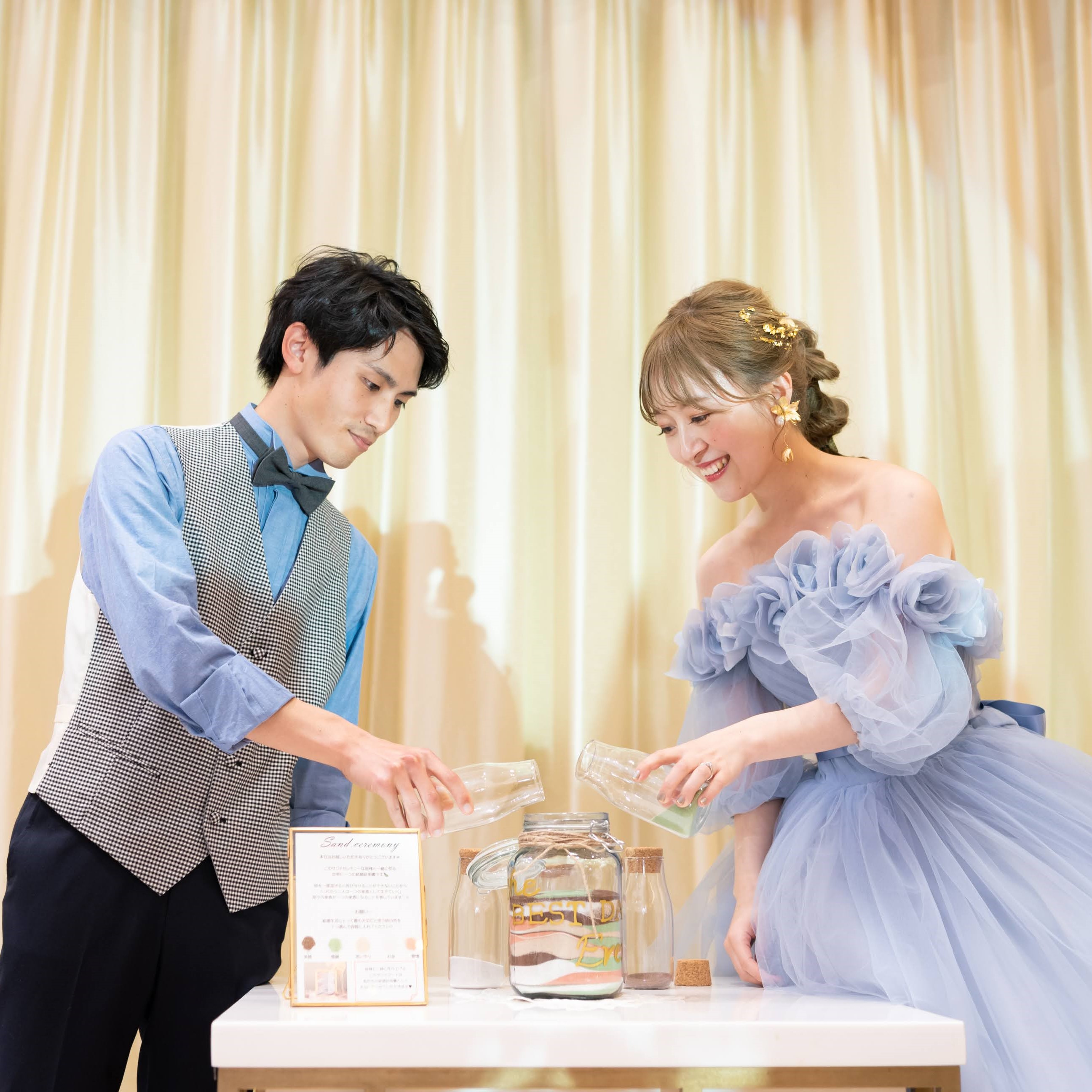 披露宴中に私たちが砂を入れて蓋を閉め、サンドセレモニー をしました。
