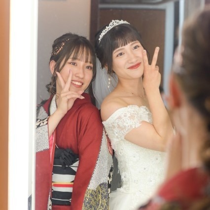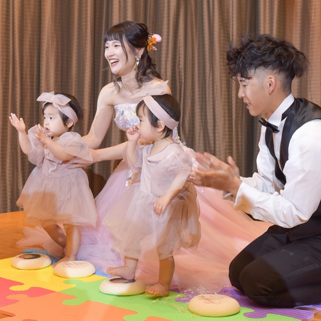 娘達の1歳の誕生日も同月だった為、そのお祝いと自分たちの結婚式を一緒にしようとこのテーマに決めました。コロナ禍の中での出産だったので親族、友人になかなか子供を会わせる事も難しく、お披露目もかねていました。笑いと感動を同時に味わい、感情の忙しい楽しい1日にしてほしいという思いもありました。