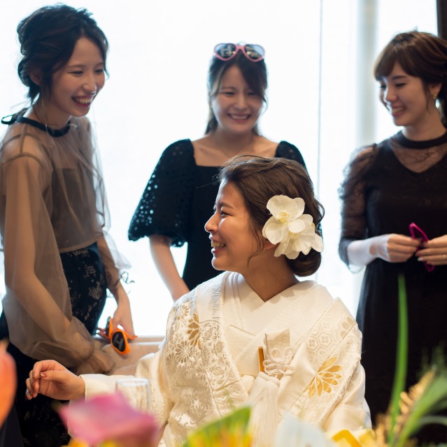 新郎が沖縄出身ということもあり、沖縄感満載の結婚式にしたく沖縄の方言であるちむどんどん(ドキドキワクワク)するようなテーマでスタッフの皆さんと一緒に準備をすすめていきました。沖縄感を出すために、BGMは沖縄ソングを流していただきました。またオリオンビール、泡盛をメニューに入れていただき、デザートビュッフェにはサーターアンダギーなど打ち合わせの際にお願いして準備をしていただきました。テーブルフラワーやブーケなども南国風でお願いしますというリクエストで作っていただきましたが、『THE 南国!』の仕上がりになっており大満足でした!最後にはゲストの皆さまとカチャーシーを踊り、ゲストの皆さまからも沖縄に行きたくなるような結婚式だったと言ってもらいました(^^)
