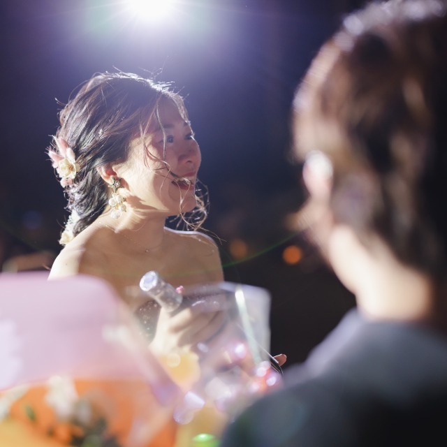 プロジェクションマッピングを使った派手な演出がとても魅力的でした。ライブのような入場をしたいという新婦の願いも叶えれたと思います。フィナーレで使用した花火の演出も外の暗さに映えてとてもよかったです。プロフィールムービーもカッコよかったです。