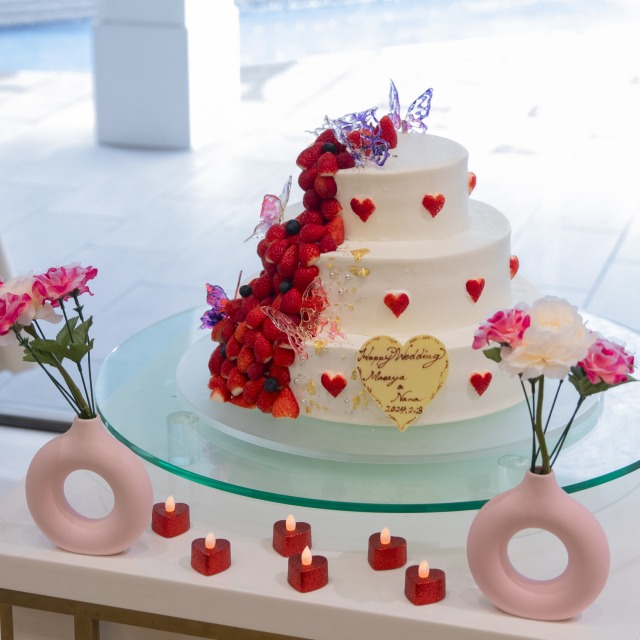 ゲストの皆さんが特に見る場所で写真や動画を撮ったりするため予定より花の値段は上がりましたが理想通りの色や量にすることができ、高砂の花の横のやケーキ台の周りの飾りもこだわることができ可愛くできたので写真も映えて満足です!