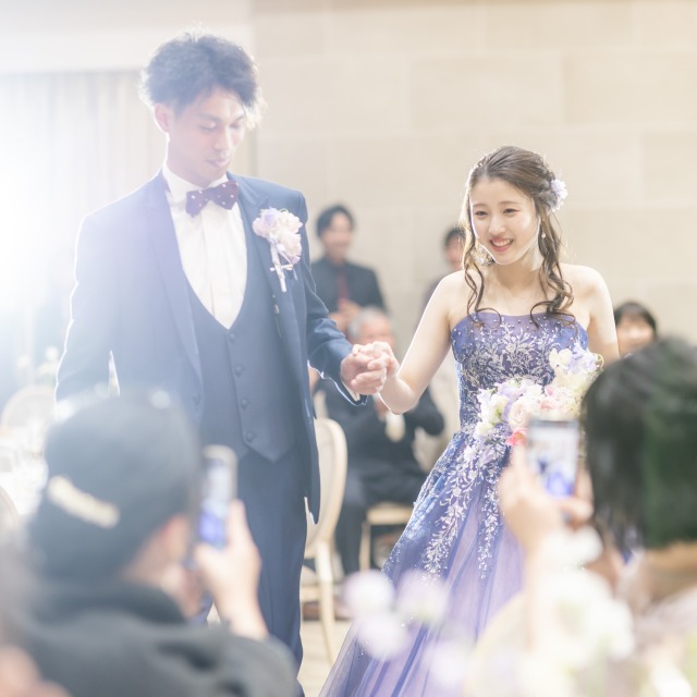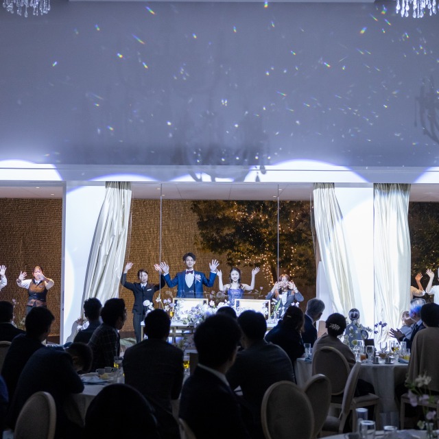 お色直し後の再入場の時に式場選びの決め手となったプロジェクションマッピングを使用しました。新婦の好きなアーティストの曲に合わせて、会場の雰囲気に合わせたプロジェクションマッピングを作っていただきました。