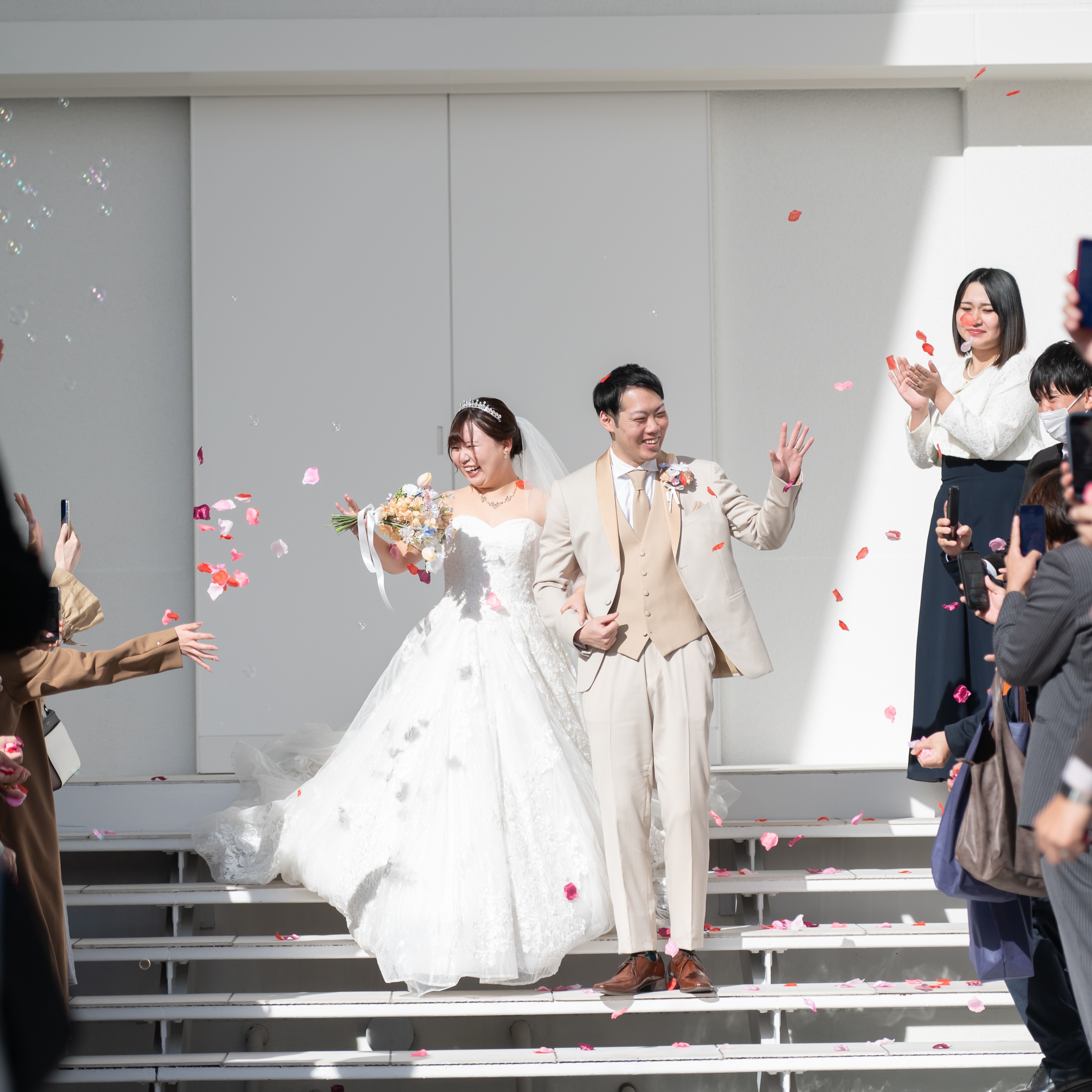 何ヶ月も前から打ち合わせや準備をして当日を無事に迎えることができました。ドレスを着るまでそんなに緊張していませんでしたが、メイクや衣装などの準備をしていくうちに緊張していきました。お互いこっそりペアレントタイムでサプライズも用意していたので驚きもあり和やかな気持ちで挙式を迎えることができ、また結婚した実感も湧きました。挙式でみんなの顔が見え感動で涙が止まらなかったです。披露宴では、本当にあっという間でした。プロジェクションマッピングから始まり、ゲストの方もすごく楽しそうで私たちもすごく楽しめました。皆んなから良かったよ!!感動したよ!!とお褒めの言葉をいただきました。ゲストのためを思って準備をしていたので、感謝を伝える事が出来たと思います。ユニフォームをみんな胸ポケットに入れ、ひとつのチームとなり式場の雰囲気を作ってもらったと思っています。本当に楽しく、もう一度結婚式をしたいと思えました。アクアデヴュー佐賀スィートテラスで結婚式が出来て良かったです。