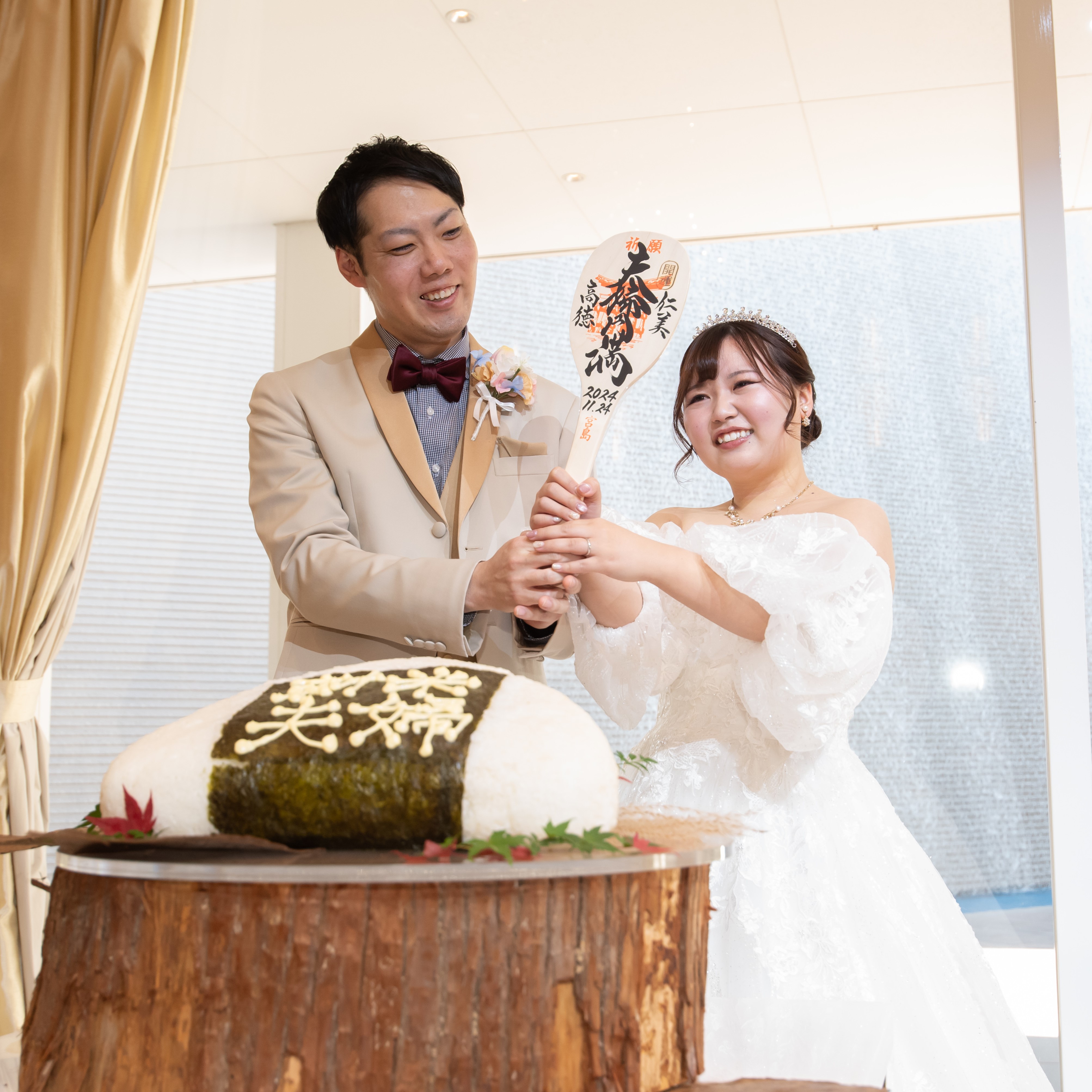 挙式の際はブーケトスならぬお菓子ブーケトス、新郎側ではキックトスを行い、ハンドの演出を加えたカップ麺ブーケプレゼントをしました。披露宴ではライブキャンバスを使用しゲストが撮った写真を随時、皆んなで共有出来るようにスクリーンで投影したり、前半戦はサッカー要素、後半戦は好きなキャラクター要素と統一感を持ってやりました。どちらもプロジェクションマッピングを使用し、オープニングのサッカー部分では動画の合成を行い、迫力ある映像が出来たと思います。再入場の階段部分は好きなキャラクター要素を取り入れ、新郎が新婦を迎えにく演出もさせて頂きました。またウエディングケーキならぬ巨大なおにぎりに「新米夫婦」と書いてもらい、おにぎりバイトをしたのもこだわりのひとつです。新米の季節と私たち夫婦の新米を掛けました。最後に余興は頼んでいませんでしたので自分達からゲストに向けてのサプライズムービーや両親や家族に贈るサンクスムービーも自作で作成しました。