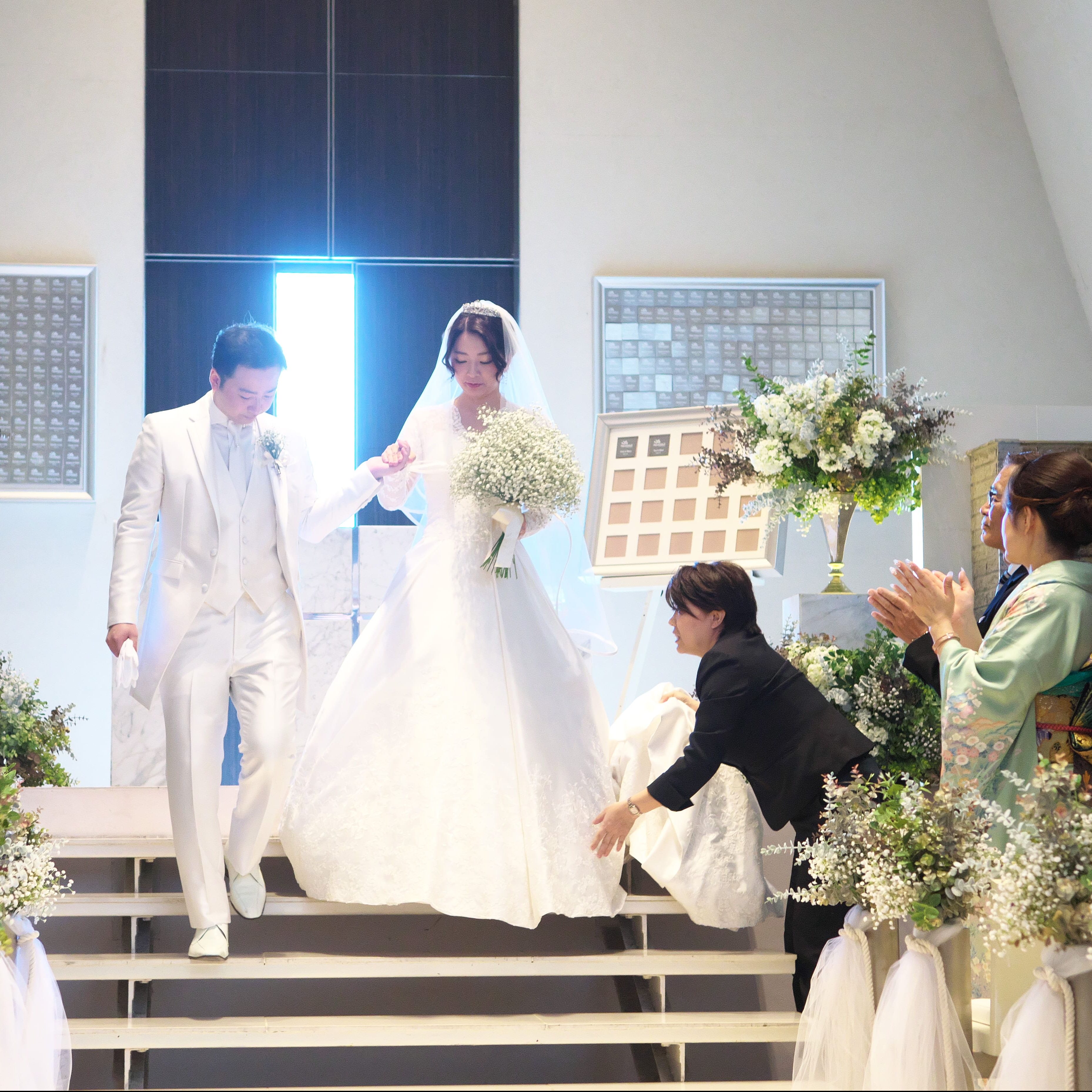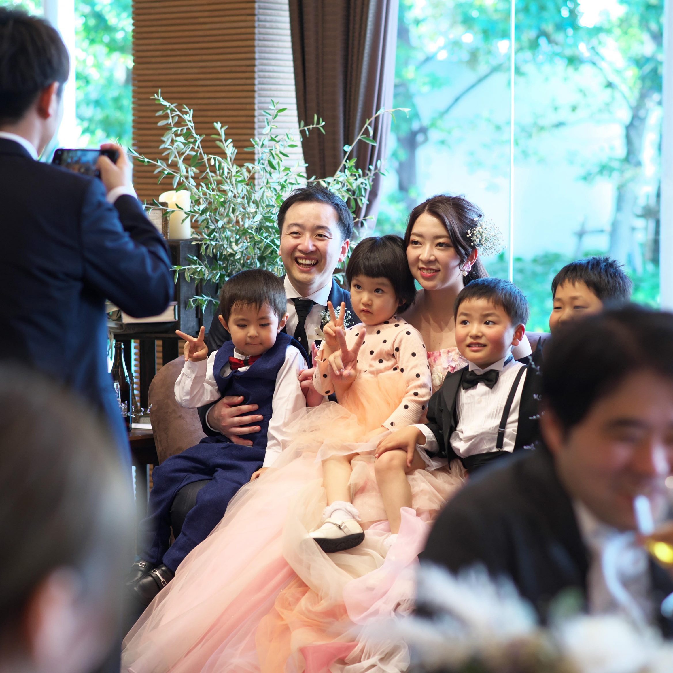 また、私たちの結婚式は子供が多かったのでフラッグガールで結婚式開会宣言をやってもらったり、挙式の入場は新郎とバルーンガール、新婦とトレーンガール参加してもらいました。