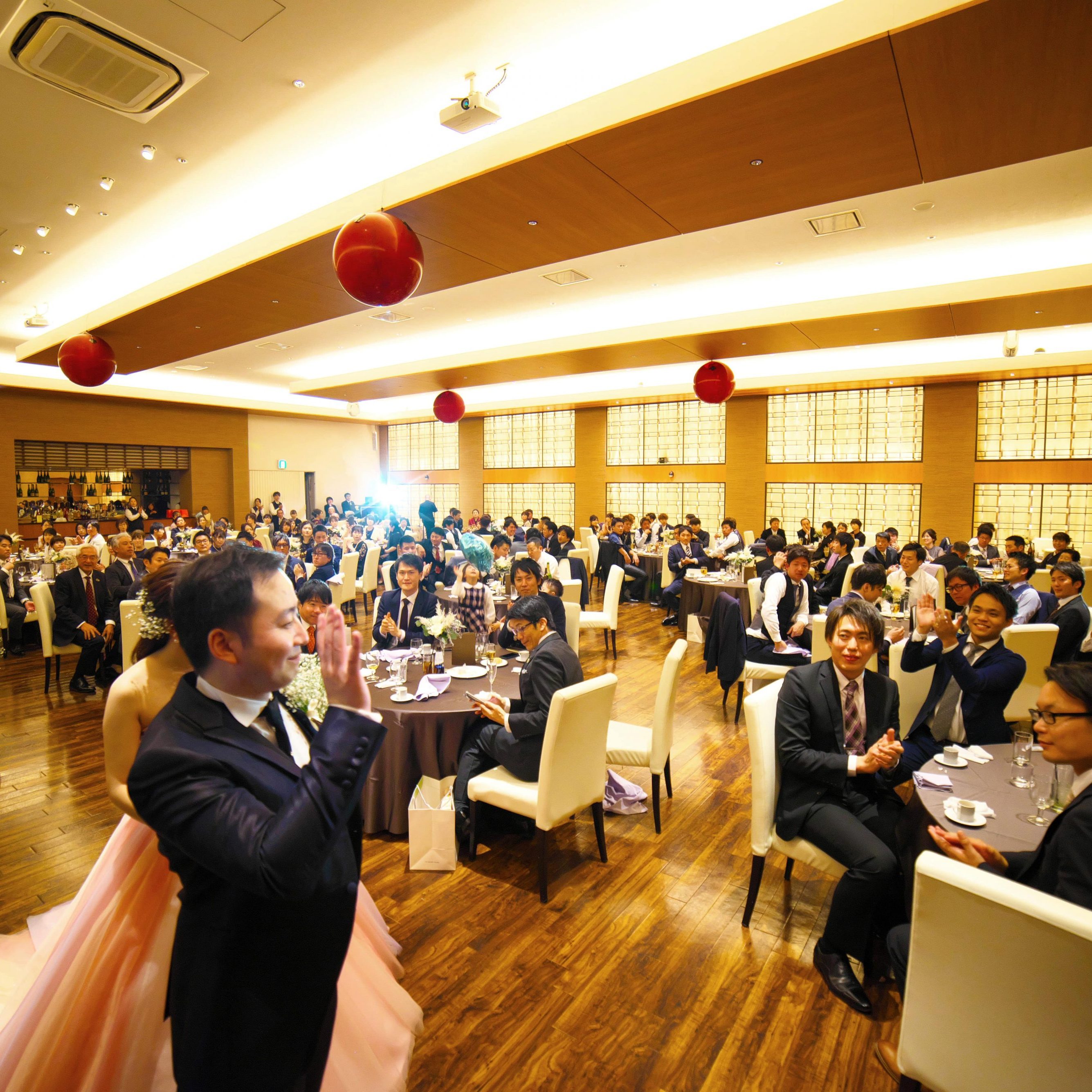 また最後にバルーンシャワーを取り入れたり、ドレス当てゲームでは、携帯の番号を書いて投票してもらい、新郎新婦で掛ける演出で楽しい結婚式になったと思います。